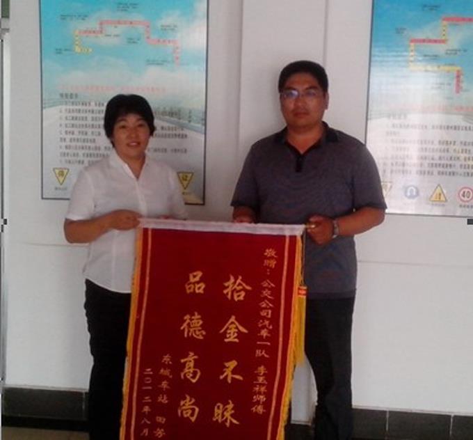 2012年8月2,長途總站東城車站職工田芳女士拿著一面寫有“拾金不昧、品德高尚”的錦旗來到市公交公司汽車一隊,感謝車隊李玉祥師傅拾金不昧的高尚品德。