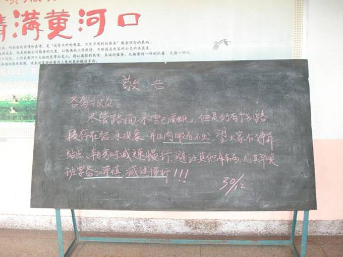 過去幾天的一場大雪,給車隊(duì)的安全生產(chǎn)帶來了很大的考驗(yàn),隨著路面上大部分積雪的融化,車輛已經(jīng)能夠基本正常運(yùn)行,但公交公司汽車三隊(duì)管理人員對安全工作絲毫不敢松懈,堅(jiān)持每天上路巡查車輛運(yùn)行情況和路面違章違紀(jì)情況,根據(jù)自身實(shí)際以敬告的形式將安全提示寫到黑板上,擺放在大廳門口,給駕駛員一個提醒,同時重點(diǎn)做好鄉(xiāng)鎮(zhèn)線路和個別駕駛員的安全叮囑工作,確保行車安全。