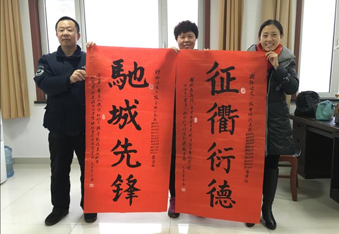 12月23日上午,家住雅苑小區(qū)的兩名乘客來到公交公司汽車六隊(duì),將親手寫的三幅毛筆字作品交到了車隊(duì)工作人員手中。