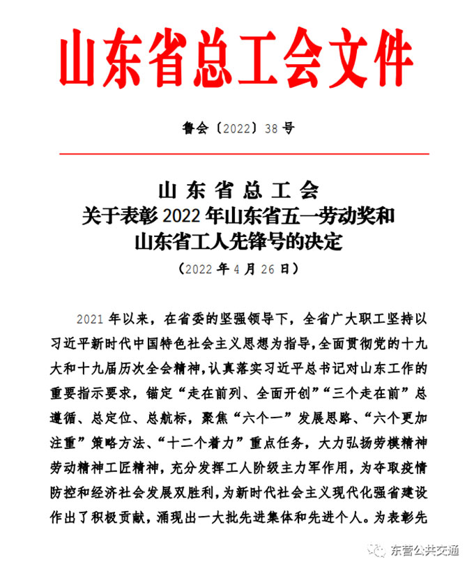 為進(jìn)一步激勵(lì)廣大職工在新時(shí)代勇?lián)率姑?,展現(xiàn)新作為,“五一”前夕,山東省總工會和東營市總工會先后印發(fā)通報(bào)表彰,對省市多家先進(jìn)集體和個(gè)人進(jìn)行表彰,東營市公共交通汽車公司駕駛員黃新強(qiáng)同志被評為山東省五一勞動獎?wù)?,東營市公共交通汽車公司9路車組被評為東營市工人先鋒號。