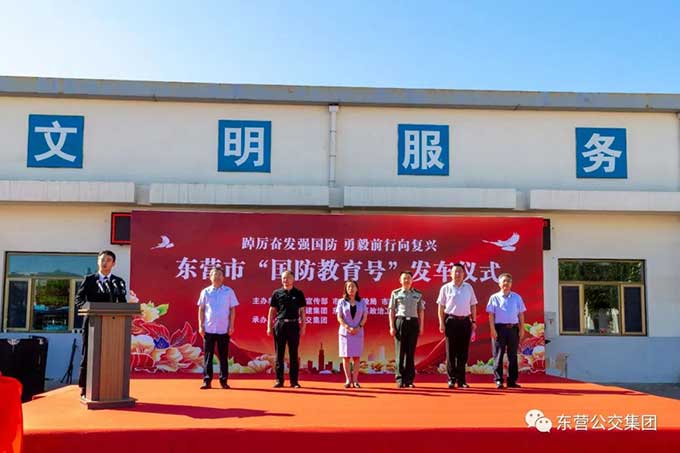 2023年9月14日上午,東營(yíng)市國(guó)防教育號(hào)發(fā)車儀式在市公交集團(tuán)隆重舉行。市委宣傳部副部長(zhǎng)邱家梅出席儀式并宣布發(fā)車,市交通運(yùn)輸局黨組成員、副局長(zhǎng)戴景鵬致辭,東營(yíng)軍分區(qū)政治工作處主任王志輝、市融媒體中心副主任趙國(guó)防、市城建集團(tuán)黨委副書記張文生、市公交集團(tuán)黨委書記趙龍等參加發(fā)車儀式。