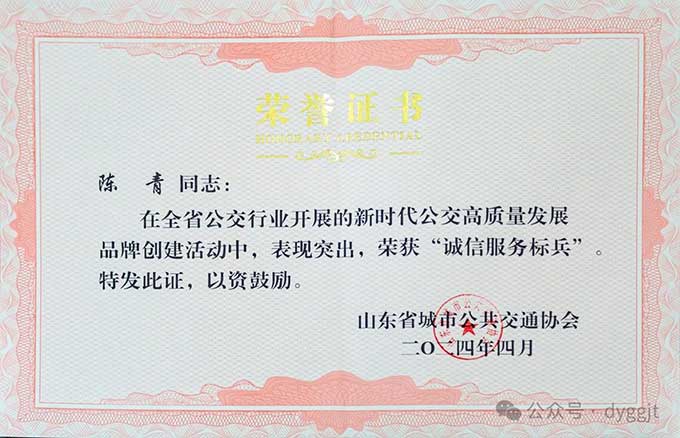陳青同志于2020年榮獲東營市“五一勞動獎?wù)隆保群螳@得東營市第一屆、第二屆城市公交駕駛員安全節(jié)能駕駛大賽中第三名和第一名的優(yōu)異成績,代表東營市參加全省城市公交駕駛節(jié)能技能大賽,并取得了優(yōu)異成績。