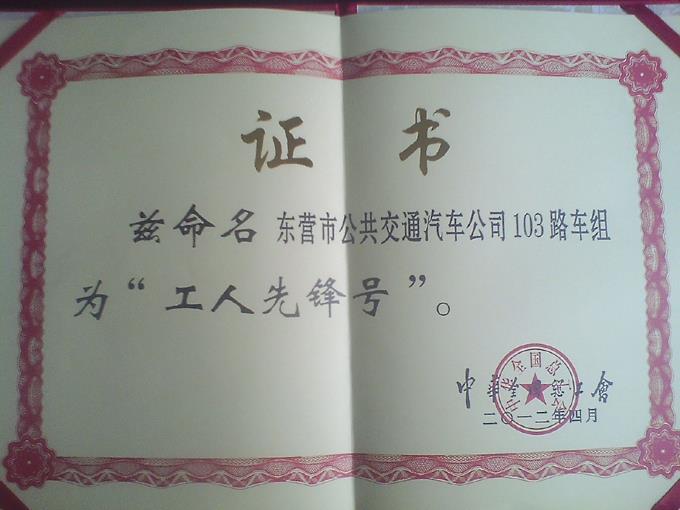 近年來,市公交公司103路車組人員把優(yōu)質服務作為積極奉獻的目標,視乘客為親人,愛崗敬業(yè),無私奉獻,出色地完成了各項營運生產任務,得到了廣大乘客的一致好評,被親切地稱之為“滿意車”、“放心車”、“安全車”。并先后獲得山東省城建行業(yè)“文明服務標兵”、東營市五一勞動獎章、東營市“十佳服務標兵”、“市級工人先鋒號”、市文明委授予的“全市十佳文明示范窗口”、省總工會授予的“山東省工人先鋒號”等多項榮譽稱號,展示了公交駕駛員良好的精神風貌,營造了和諧文明的社會氛圍。