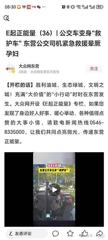 市公交集團(tuán)汽車五隊駕駛員金繼兵救助孕婦事跡被媒體廣泛報道,引發(fā)數(shù)十萬網(wǎng)友瀏覽,并紛紛留言點贊。