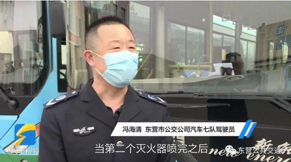 恰巧在這個(gè)時(shí)候,東營市公交公司公交車駕駛員馮海清駕駛178路公交車行駛至東營市一中站點(diǎn)附近,于是帶著車上的滅火器趕緊上前施救。然而噴完一罐滅火器后,煙依然很大,馮海清便趕忙回到車廂拿了兩罐,當(dāng)?shù)诙€(gè)滅火器噴完之后,火勢(shì)得到有效控制,最終在噴完第三罐滅火器后,徹底把火撲滅了。
